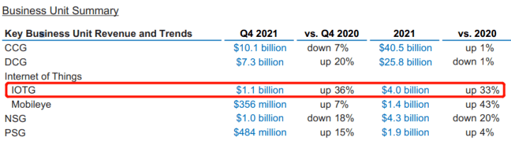 在晶圓代工巨頭臺(tái)積電公布的財(cái)報(bào)中,2021年其手機(jī)業(yè)務(wù)營(yíng)收首次被HPC(大型高性能計(jì)算)業(yè)務(wù)超越,面向汽車板塊的營(yíng)收和訂單需求也猛增。 圖像傳感器芯片設(shè)計(jì)龍頭韋爾股份最新財(cái)報(bào)顯示,其半導(dǎo)體業(yè)務(wù)收入同比增長(zhǎng)18%,雖然智能手機(jī)CMOS占據(jù)營(yíng)收大頭,但業(yè)績(jī)?cè)鲩L(zhǎng)主要來(lái)源于車載CIS與安防CIS,尤其在安防領(lǐng)域?qū)崿F(xiàn)高達(dá)60%的業(yè)績(jī)?cè)鲩L(zhǎng)。 2021年物聯(lián)網(wǎng)事業(yè)部(IoTG)成為國(guó)際半導(dǎo)體巨頭英特爾增長(zhǎng)最快的業(yè)務(wù),同比增長(zhǎng)33%,同時(shí)汽車自動(dòng)駕駛業(yè)務(wù)也增速驚人,反觀主營(yíng)PC終端的CCG部門業(yè)績(jī)僅增1個(gè)百分點(diǎn)。