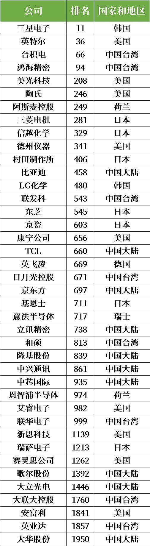 據(jù)統(tǒng)計(jì),2000強(qiáng)榜單中有41家半導(dǎo)體相關(guān)公司,其中包括中國(guó)大陸企業(yè)10家,中國(guó)臺(tái)灣企業(yè)9家。
