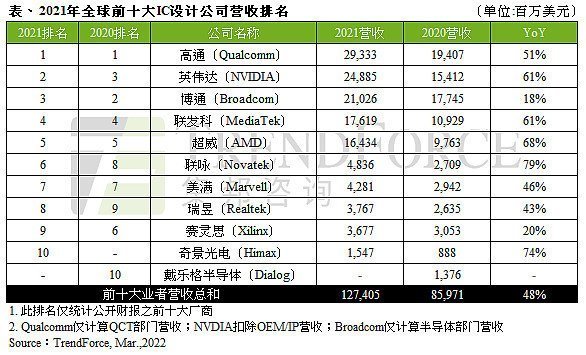 據(jù)TrendForce集邦咨詢研究顯示,2021年由于各類(lèi)終端應(yīng)用需求強(qiáng)勁,導(dǎo)致晶圓缺貨,全球IC產(chǎn)業(yè)嚴(yán)重供不應(yīng)求,連帶使芯片價(jià)格上漲,拉抬2021年全球前十大IC設(shè)計(jì)業(yè)者營(yíng)收至1,274億美元,年增48%。